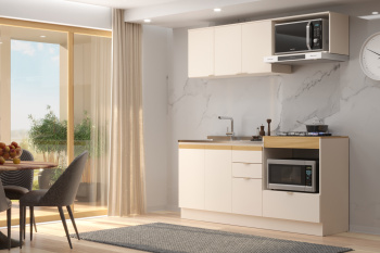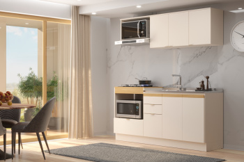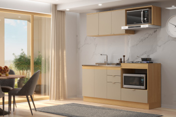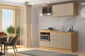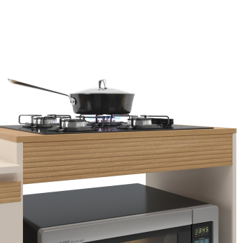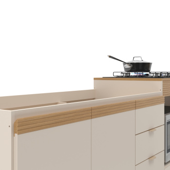 - Puxadores cava em MDF na parte superior do balcão e puxadores plásticos no restante da cozinha